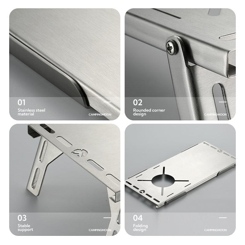 CampingMoon Solo Stove Table + Bag is a compact and versatile table designed for solo campers and outdoor enthusiasts. Crafted from military-grade stainless steel, it offers a 3-in-1 functionality: serving as a windbreak, heat insulator, and a stable platform for cooking or tea ceremonies. Its textured surface ensures anti-slip and heat resistance, capable of withstanding direct flame contact and extreme temperatures. The integrated wind protection system enhances stove efficiency by up to 30% in breezy conditions. Lightweight and foldable, it comes with a durable storage bag for easy transport.