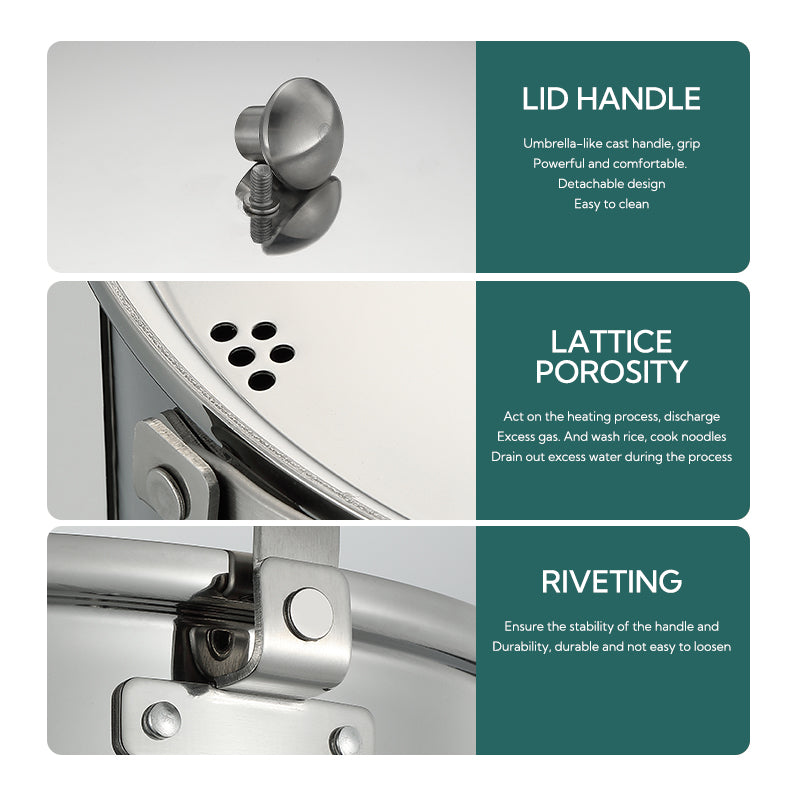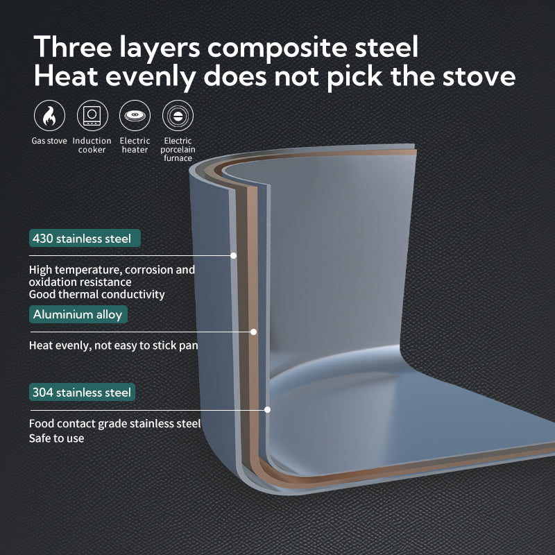 This large pot has a three-layer structure of stainless steel and aluminum. The three-layer structure sandwiches aluminum, which is "lightweight and has high thermal conductivity," between stainless steel, which is "durable and has excellent heat retention." Its sophisticated design makes it suitable for boiling pasta, boiling vegetables, making chili, stew, and soup, and for use in camping kits and in cooking in the kitchen.