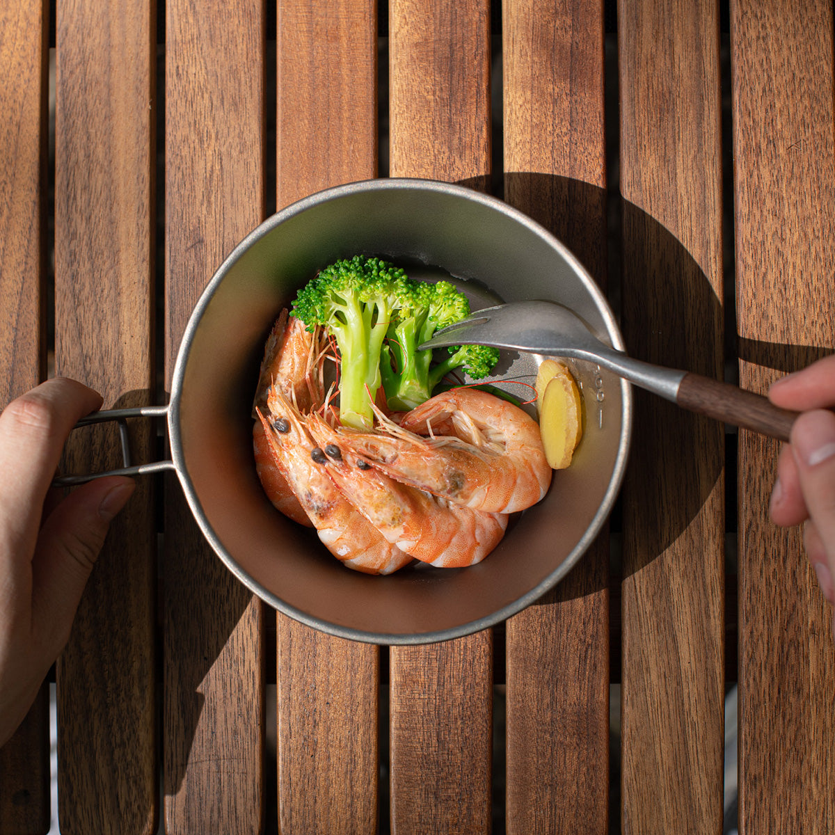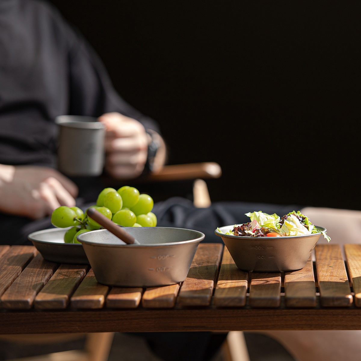 Titanium camping tableware for picnics and camping. Very resistant thanks to its titanium material.