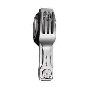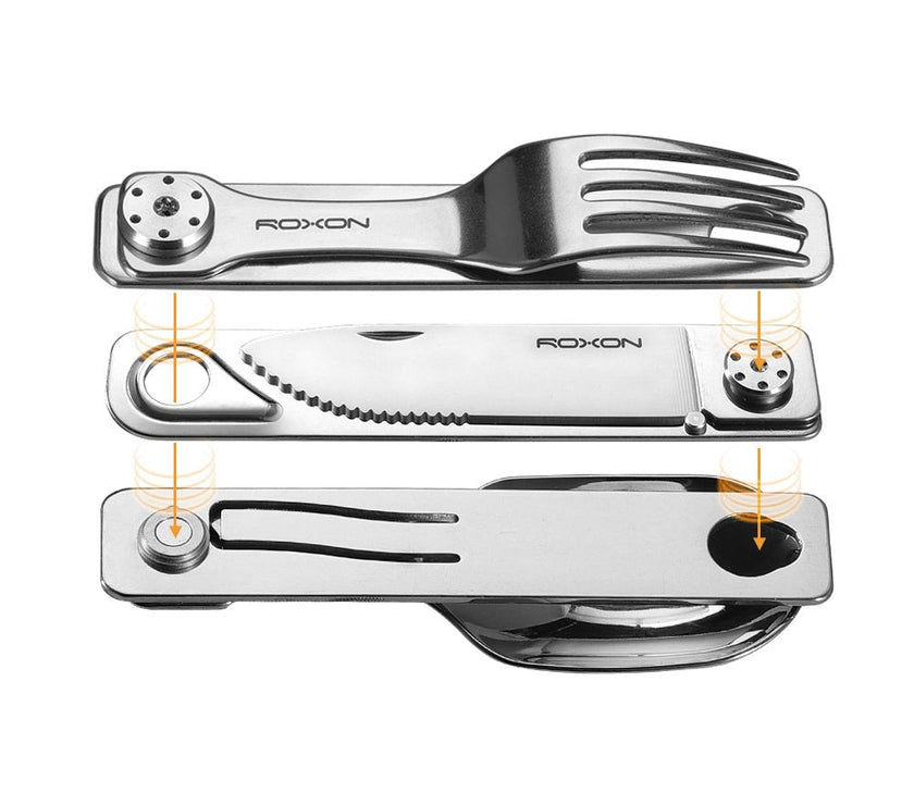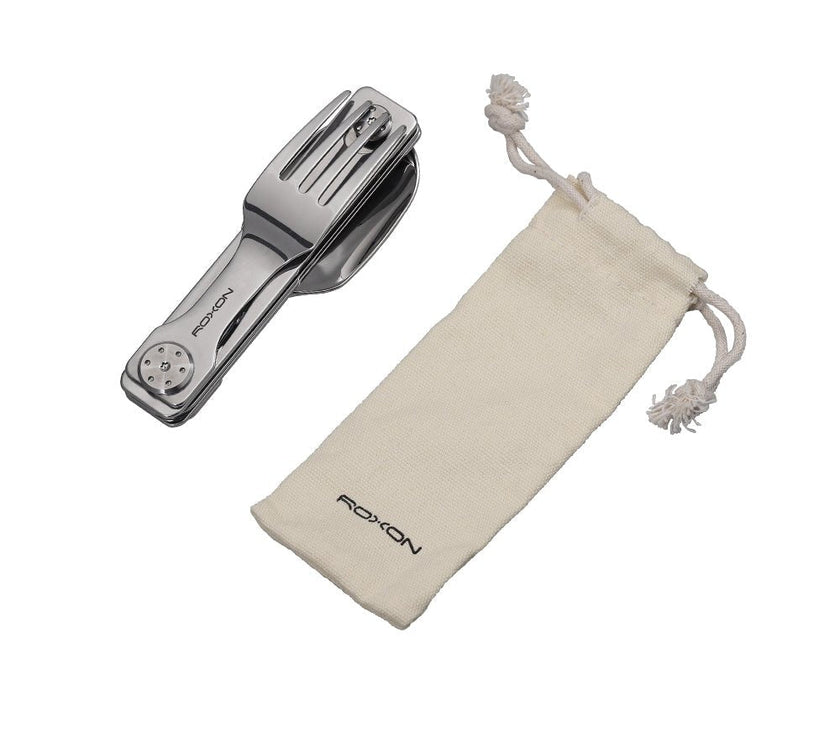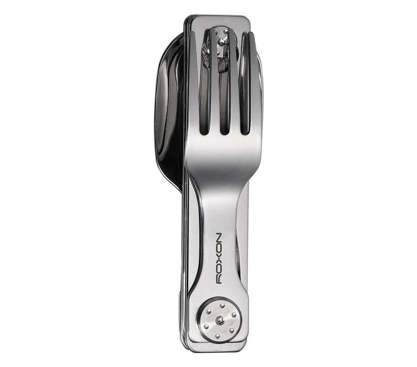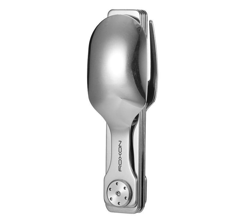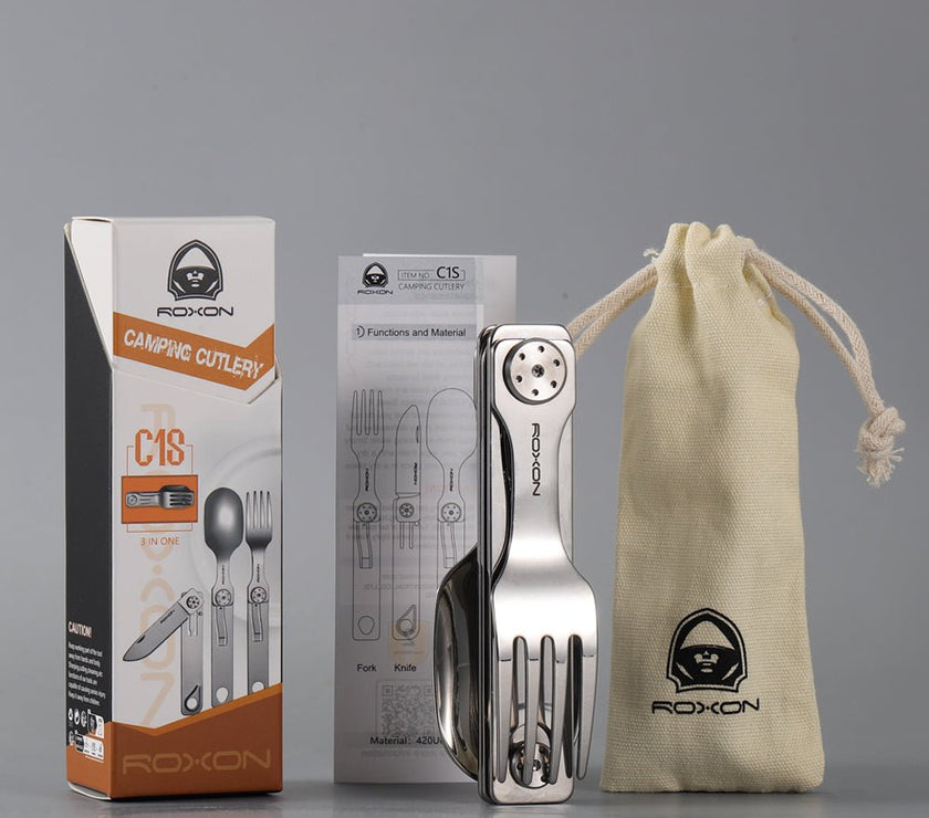 The ROXON C1 is a compact and versatile 3-in-1 stainless steel cutlery set designed for everyday carry, camping, travel, and outdoor dining. It features a full-size spoon, fork, and serrated knife, all folding neatly into a pocket-sized tool.↳